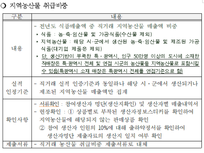 1. 취급 비중 | 15점 | 10점 | ◉ 직거래 농산물 취급비중 - 전년도 식품매출액 중 직거래 농산물 매출액 비중 * 식품 : 농·축·임산물 및 가공식품(수산물 제외)농산물 : 농·축·임산물, 농·축·임산가공품(제조원이 해당 시·군에 소재하는 경우에 한함 / 대기업 제외) |