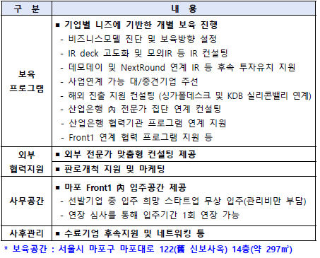 | 지원사항 | 자금, 투자, 멘토링, 공간, 사후관리 등 |