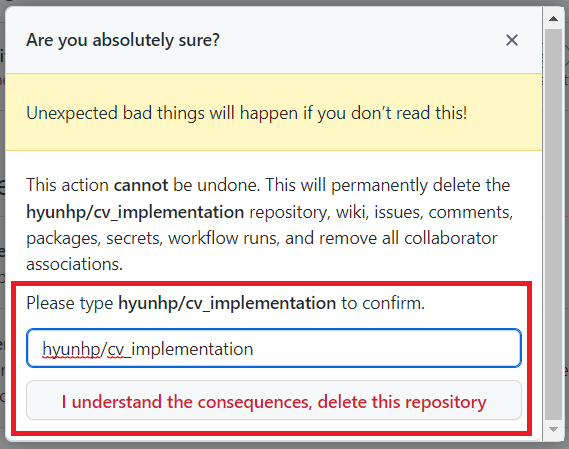 굵게 처리된 레포지토리의 파일 위치를 작성하게 되면, 성공적으로 레포지토리를 삭제할 수 있습니다.