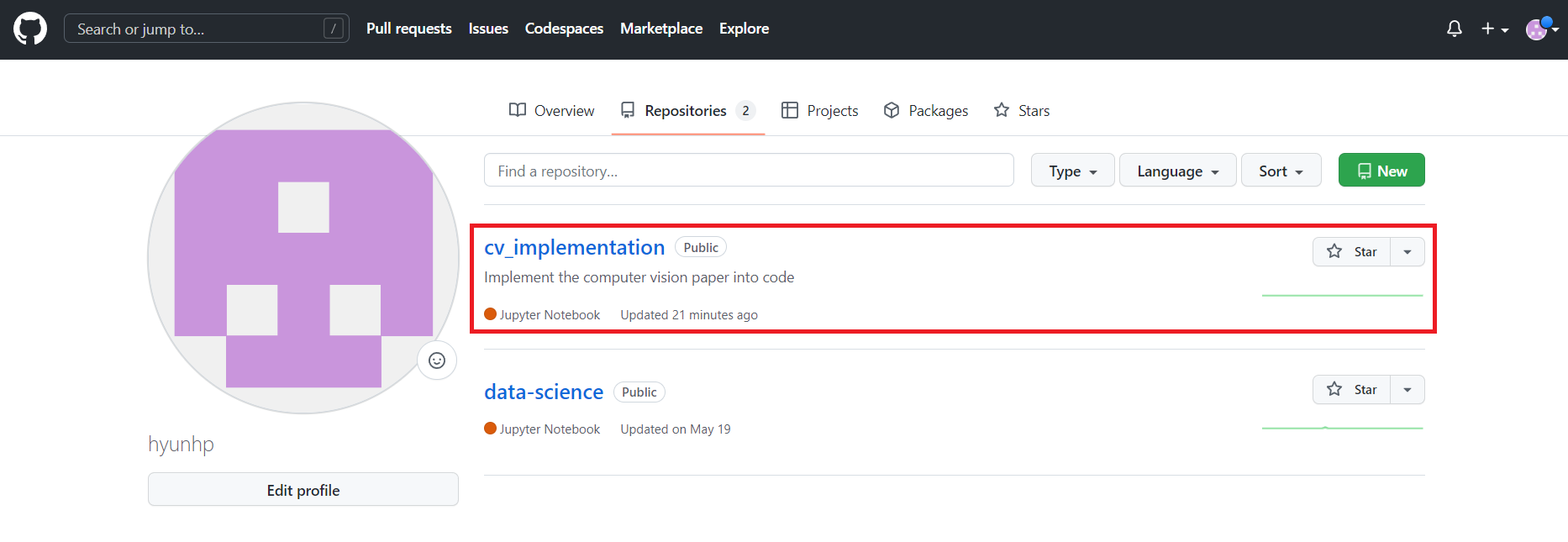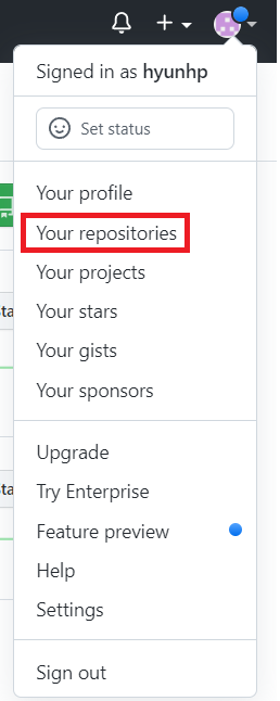 - 우측 상단의 상태창에서 "Your repositories"를 선택