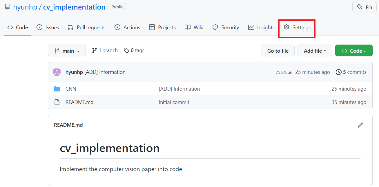 레포지토리에 접속한 이후에, 상단 메뉴에 'Settings"를 선택하시면 됩니다.