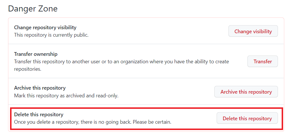 그중에서 "Delete this repository"를 선택하면 됩니다.