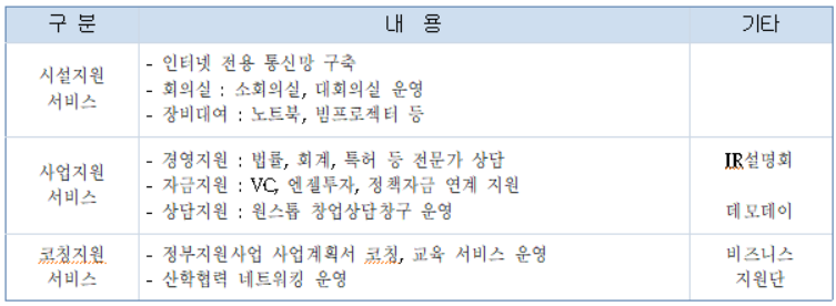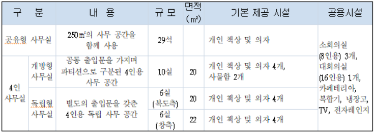| 지원사항 | ⓐ 사무실 공간 지원 ⓑ 지원 서비스( 시설지원, 사업지원, 코칭지원) |