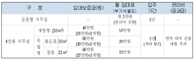 | 특이사항 | ⓐ 최초 1년 입주 계약을 통해, 연장하여 최대 5년까지 입주 가능 ⓑ 예비창업자도 신청 가능하며, 입주 후 3개월 이내 사업자 등록 필수 |