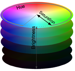 HSL에서 색상은 이 세 가지 차원의 조합으로 표현됩니다. 예를 들어 밝고 완전히 채도가 높은 빨간색의 색상은 색조가 0도, 채도가 100%, 명도가 50% 일 수 있습니다.