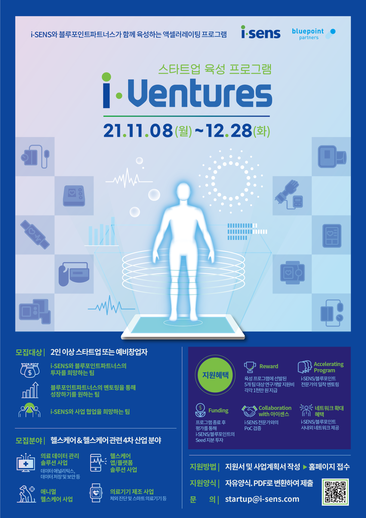이번에 '아이센스(i-SENS)'와 '블루포인트파트너스'가 'i-Ventures 스타트업 육성 프로그램'을 통해 '헬스케어 & 헬스케어 관련 4차 산업 분야를 선도할 스타트업을 육성하고 혁신 생태계를 조성'하기 위해 신규 기업을 모집하고 있습니다.