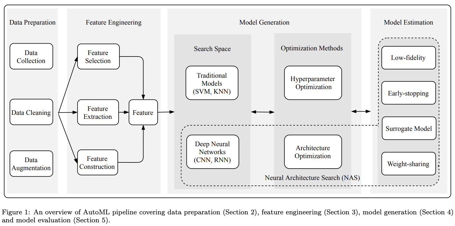 AutoML 분야는 데이터, 변수, 모델의 관점에서 data preparation, feature engineering 그리고 model generation, model evaluation 이렇게 4개 분야로 정리하고 있습니다. (ref. AutoML: A Survey of the State-of-the-Art, 2021)