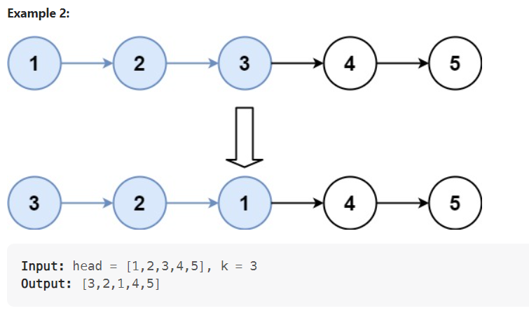 즉, k = 2, head = [1,2,3,4,5]는 2 범위인 [1, 2] 그리고 [3, 4]를 내부에서 역순으로 정렬하여 [2, 1] 그리고 [4, 3]으로 변경합니다. 그리고 나머지 [5]를 연결하여, 최종적으로 [2,1,4,3,5]로 반환해야 합니다.