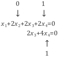 아래는 Ux=0에서 해(solution) x벡터를 나타냅니다. x2와 x4에 임의의 값을 설정할 수 있으며, 강의에서는 계산하기 편하도록 x2=1, x4=0으로 설정했습니다.