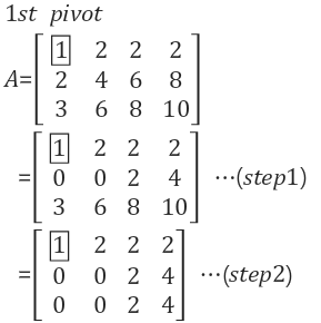 A의 첫 번째 pivot은 1입니다. pivot 바로 아래의 원소인 A(row2, col1)=2를 소거해야 하므로, row2 = row2 - 2*row1를 계산하면 식 (2)의 step1과 같이 됩니다. row3도 역시 소거를 하려면 row3 = row3 - 3*row1를 계산하면 step2와 같이 됩니다.