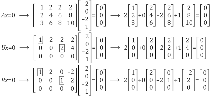 행렬 A에서 U로 행렬을 변환한 뒤에도, Ax=0와 Ux=0의 해는 동일한 Null space에 존재함을 알았습니다. 그리고 행렬 U를 소거하여 만든 Rx=0의 해도, 동일한 Null space에 존재하는 것을 확인할 수 있습니다. 이를 아래에서 확인해 보겠습니다.