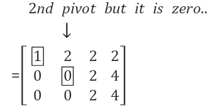 만약 두 번째 pivot의 아래의 원소 A(row3, col2)가 0이 아닌 값을 가진다면, 행 교환(row exchange)을 통해 pivot값을 바꿔서 설정해 주면 됩니다. 그러나 원소 A(row3, col2)가 0이기 때문에 결과적으로 column 2에서의 소거는 더 이상 진행되지 않습니다. 즉 두 번째 pivot은 column 2에 없습니다.