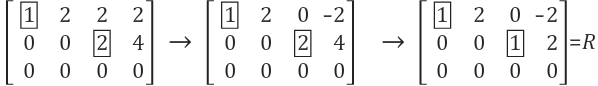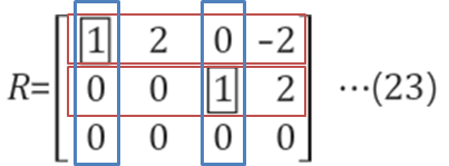 빨간색 box는 pivot row를, 파란색 box는 pivot column을 나타냅니다. 이 둘이 겹쳐지는 2x2 크기의 단위행렬의 모습을 확인할 수 있습니다. 단위행렬이 나타나는 이유는, 행렬 A를 소거하는 과정에서 pivot variable의 위/아래의 모든 원소를 0으로 맞추었고, 모든 pivot을 1이 되도록 만들었기 때문입니다.