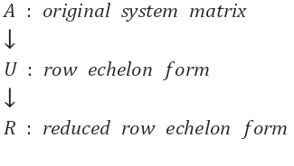 행렬 A를 소거(elimination)하여 기약사다리꼴 행렬 U를 만들었습니다. 이때의 U는 계단 형태를 보였고 이를 echelon 형태라고 합니다. echelon 형태는 임의의 행렬에 가우스 소거법(Gauss Elimination)을 적용했을 때 계단 모양이 나오며, 몇 가지 조건을 만족하는 행렬을 의미합니다.