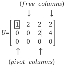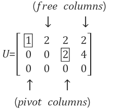 column 2에 원래 존재해야 할 pivot이 없는 이유는, 앞에서 살펴본 것처럼 A의 column 2는 column 1에 종속적(dependent)이기 때문입니다. 행렬 A를 보면 col1의 2배가 col2이며. 즉 두 column이 같은 선상에 위치한다는 의미입니다.