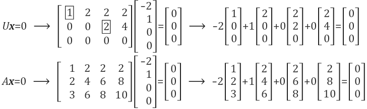 x가 선형방정식에서 의미하는 것은 2*col1+0*col2-2*col3+1*col4입니다. U와 A의 방정식에 각각 대입하여 계산해 보면 성립하는 것을 알 수 있습니다.