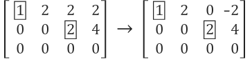 세 번째 column의 두 번째 row부터는 0이 아닌 값이 존재합니다. 결국 두 번째 pivot은 A(row2, col3)=2가 됩니다. 네 번째 column은 3 번째 pivot column에서 1번째 pivot column을 뺀 것에 2배를 하면 구할 수 있습니다. column 관점에서 pivot column을 구하게 되면, 1번째 그리고 3번째 column이 됩니다.