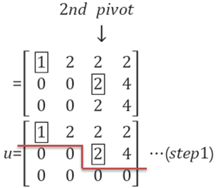 그리고 row 관점에서 생각하면, 두 번째 pivot을 기준으로 아래의 원소들을 0으로 만들 수 있습니다. 이때 아래의 row3와 pivot이 있는 row2는 같습니다. 따라서 row3=row3-1*row2가 됩니다. 이를 통해 1 번째 row와 2번째 row가 pivot row가 됩니다.