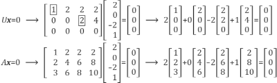 Ux=0에서 구한 해 x를 Ax=0에도 똑같이 적용해도 식이 성립하는 것을 볼 수 있습니다.