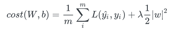 - 이때 λ (람다, lambda)는 규제에 얼마나 비중을 줄 것이 정하는 계수입니다. 0에 가까울수록 정규화의 효과는 사라집니다. 적절한 λ의 값은 k-fold cross validation과 같은 방법으로 찾을 수 있습니다.