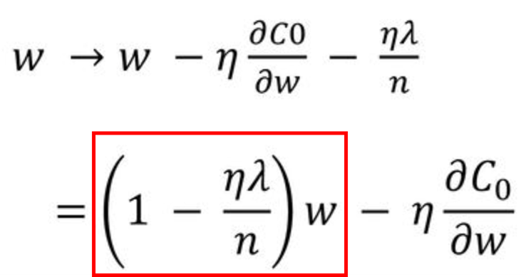 weight의 크기에 따라 가중치의 페널티 정도가 달라지기 때문에 가중치가 전반적으로 작아져서 학습 효과가 L1 대비 더 좋게 나타납니다. λ(람다) 값에 따라 페널티의 정도를 조절할 수 있습니다. L2 regularization을 적용한 Cost Function의 편미분 결과. 가중치의 크기에 따라 가중치 값을 감소시킬 수 있습니다.