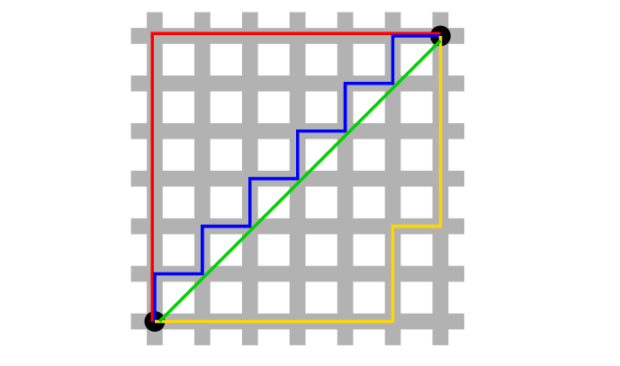 - L1 norm (Manhattan distance, Taxicab geometry), p = 1