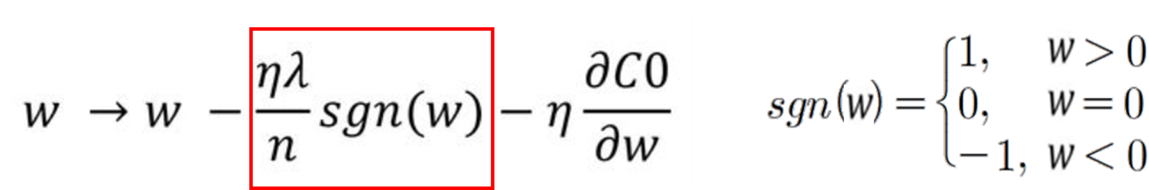 따라서 특정 weight들을 0으로 만들 수 있어 원하는 weight만 남길 수 있는 feature selection 역할을 할 수 있습니다. 이를 통해 특정 가중치를 삭제해 모델의 복잡도를 낮출 수 있습니다. L1 regularization을 적용한 Cost Function의 편미분 결과를 가중치 부호에 따라 가중치 값에 상수만큼 더하거나 뺄 수 있습니다.