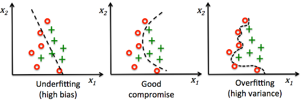- 세 번째 그래프에서는 low bias & high variance가 발생하였는데, 이는 모델이 필요 이상으로 복잡하여 예측값 간의 편차가 크게 발생하는 경우입니다. 이와 같은 경우를 overfitting이 발생하였다고 볼 수 있습니다.
