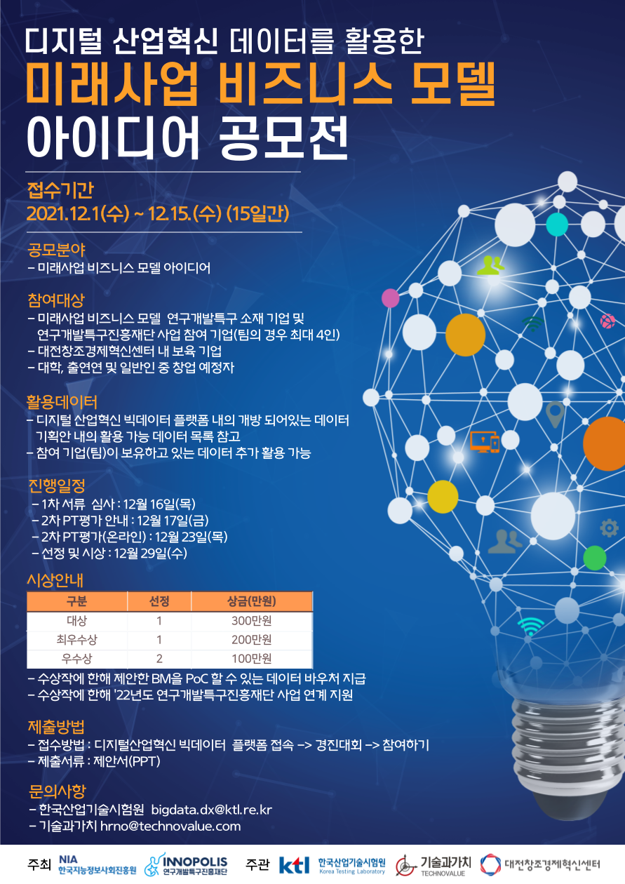 이번에 '한국지능정보사회진흥원(NIA)'와 '연구개발특구진흥재단(INNOPOLIS)'가 '디지털 산업혁신 데이터 활용 뉴 비즈니스 아이디어 공모전'을 통해 '디지털 산업혁신 데이터를 활용한 미래사업 비즈니스 모델 아이디어 활성화'를 위해 신규 기업을 모집하고 있습니다.