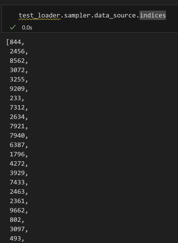 - test_loader.sampler.data_source.indices: DataLoader가 사용한 인덱스를 나타냅니다. 이를 통해 어떤 데이터가 실제로 사용되었는지 확인할 수 있습니다.