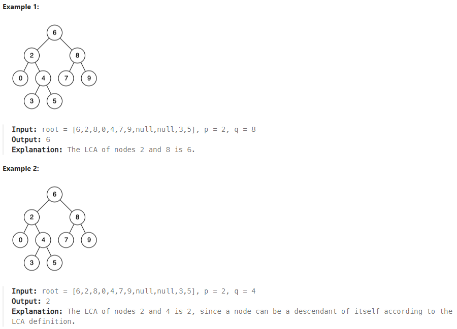 The lowest common ancestor between two nodes p and q is the lowest node in a tree T such that both p and q as descendants. The ancestor is allowed to be a descendant of itself.