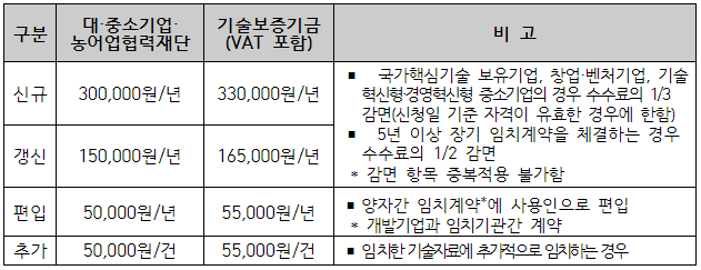 | 특이사항 | 신청 기업의 형태에 따라 발생하는 임치 수수료(기술자료 임치에 따른 수수료)가 상이함 |
